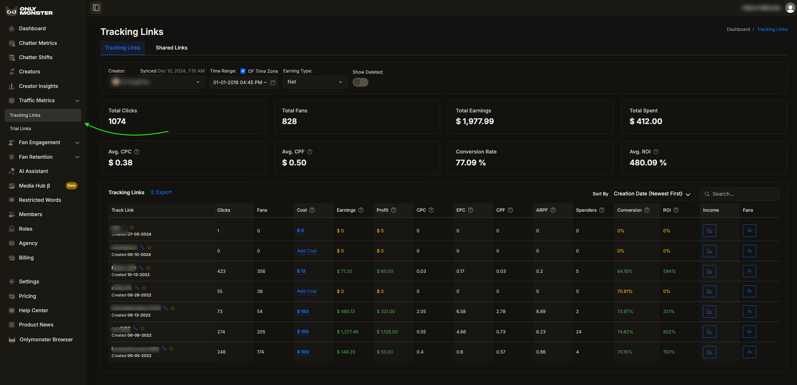 * **Comprehensive Data:** While OnlyFans gives a glimpse into clicks and fan numbers, with Traffic Metrics, once you input the traffic cost, you'll see metrics like profit, cost per click and fan, earnings per click, and average revenue per fan.