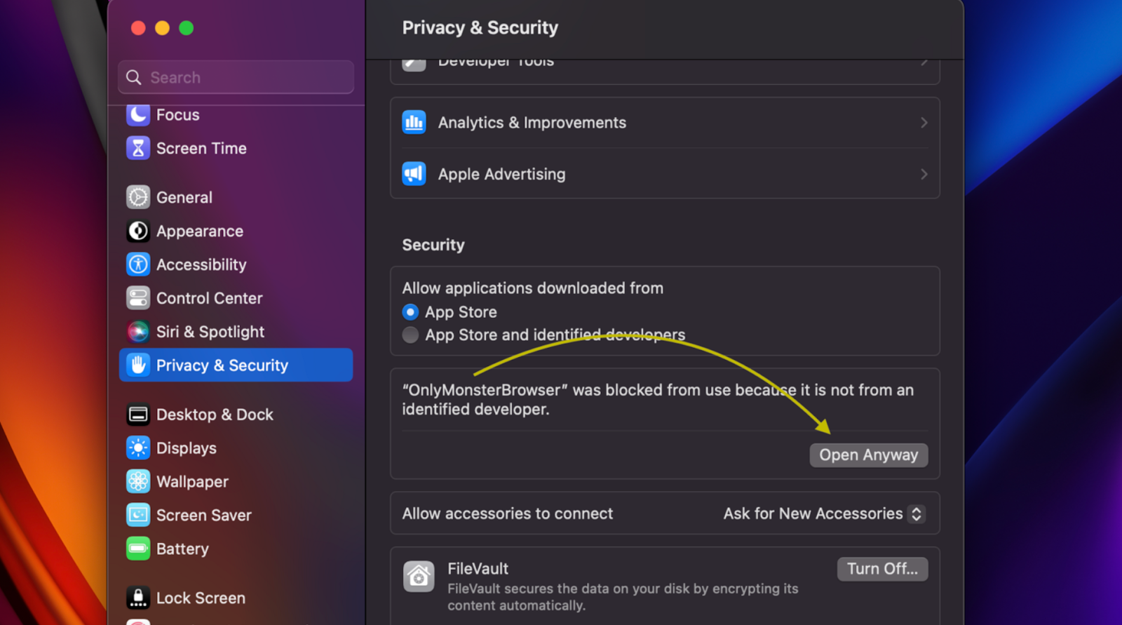 Under the General tab, click "Open Anyway" next to the message about the OnlyMonster browser.