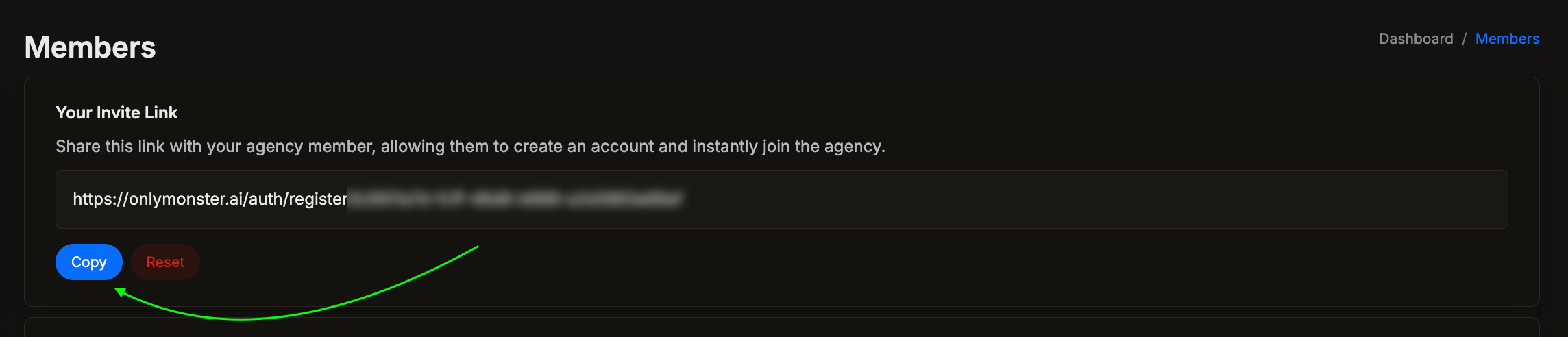 To share the unique invite link, navigate to the ["Members"](https://onlymonster.ai/panel/members/) page, copy the link, and send it to the new employee.
