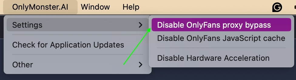 Disable OnlyFans Proxy Bypass: Go to OnlyMonsterAI > Settings > Disable OnlyFans Proxy Bypass. (On Windows OS, right-click the monster icon to find the settings.)